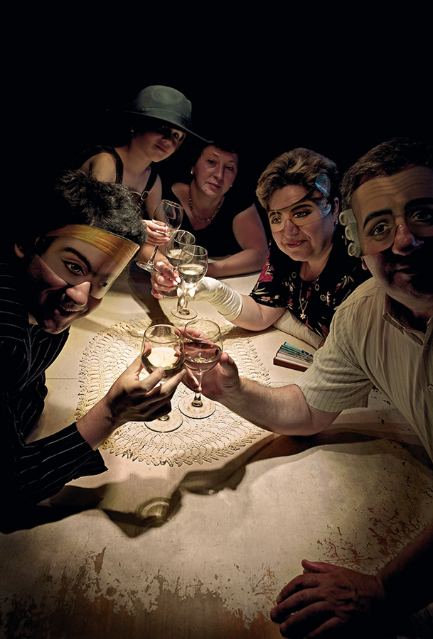 Sher was born in Lithuania in 1969, and came to Israel with her family at the age of 21. The photographs display a preoccupation with her culture and the issue of foreignness. In an excellent photograph she placed her family around a dining table. They are holding empty glasses, their faces and eyes hidden by masks, and the dim light creates a moment of sinister gaiety.